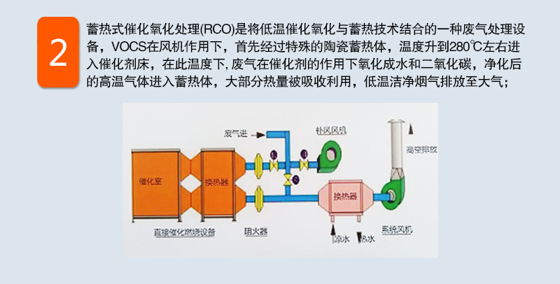 催化燃燒過程是在催化燃燒裝置中進行的,VOCs先通過熱交換器預熱到200~400℃,再進入燃燒室,通過催化劑床時,碳氫化合物的分子和混合氣體中的氧分子分別被吸附在催化劑的表面而活化,由于表面吸附降低了反應的活化能,碳氫化合物與氧分子在較低的溫度下迅速氧化,產(chǎn)生二氧化碳和水;催化氧化技術主要分為催化氧化處理(CO)和蓄熱式催化氧化處理(RCO)。