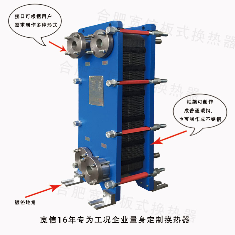 寬信板式換熱器結(jié)構(gòu)是由許多沖壓成型的不銹鋼薄板,通過密封墊圈由導(dǎo)桿及兩端的壓緊裝置組合成一體,其中間的板片數(shù)可根據(jù)生產(chǎn)狀況隨意調(diào)節(jié),冷熱流體在薄壁傳熱板兩側(cè)互相對流,進(jìn)行熱交換。這一結(jié)構(gòu)特征使得板式換熱器不僅能滿足各個行業(yè)熱交換設(shè)備的基本要求,而且還具有以下自身特有的優(yōu)點: