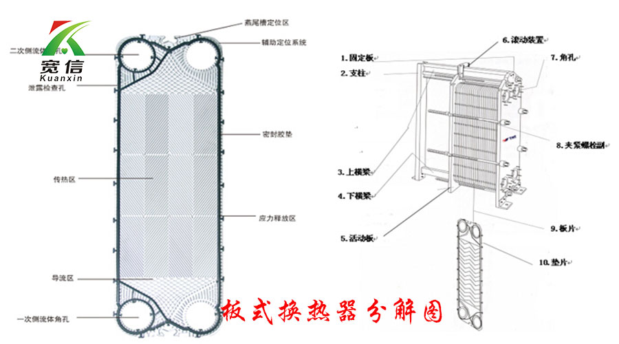 板式換熱器顧名思義是一種熱交換設備,在一些耗能高的設備中安裝可以進行熱量交換。它是由一系列波紋形狀的金屬板片疊裝而成的新型效率高的熱交換設備,構造中包括密封墊片、壓緊(活動端板、固定端板)和框架(上、下導桿及支柱)組成,板片之間由密封墊片進行密封并導流,將冷熱流體通道分隔開來,冷熱介質分別在各自通道流過,與相隔的板片進行熱量交換,從而達到用戶所需要的溫度。