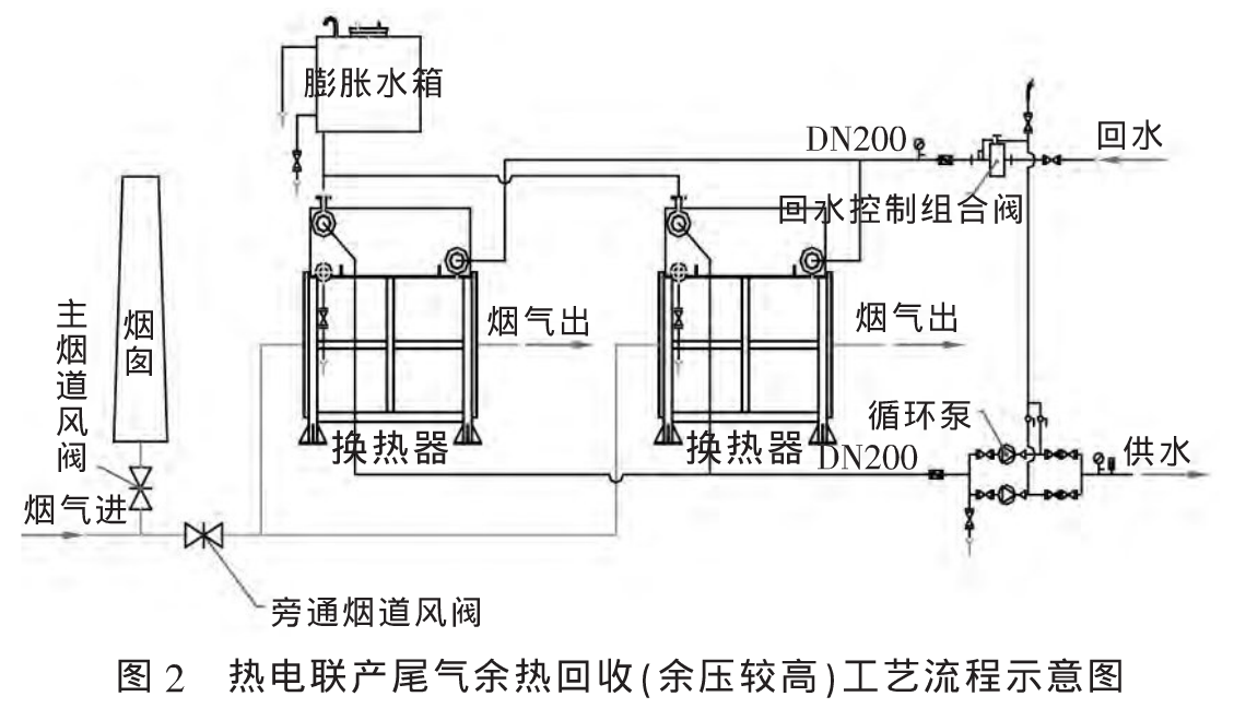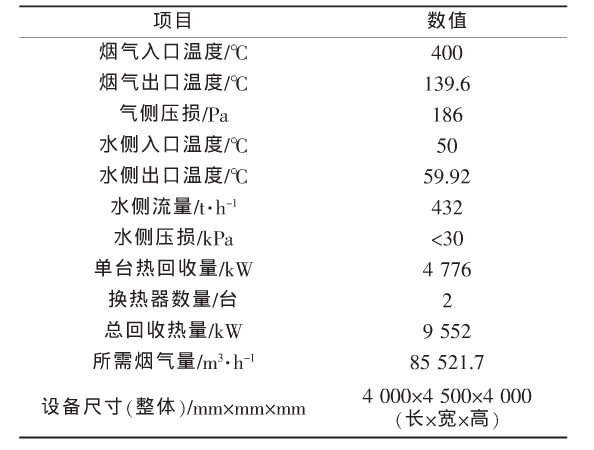 (1)如果熱電聯(lián)產(chǎn)尾氣有較高的余壓,換熱器可置于旁通煙道上,并在主煙道上加設(shè)風(fēng)門,通過調(diào)整主煙道風(fēng)門開度,調(diào)整流過換熱器的煙氣量,以控制換熱器的余熱回收量來匹配中央空調(diào)的用熱量。換熱器煙側(cè)流速采用較低的數(shù)值,以降低換熱器的煙側(cè)阻力。為便于換熱器的運(yùn)輸,換熱器需做成兩臺(tái),并聯(lián)使用。排煙壓力較小,設(shè)備壓力損失200Pa,采用兩臺(tái)設(shè)備。工藝流程如圖2所示,設(shè)計(jì)參數(shù)見表2。
