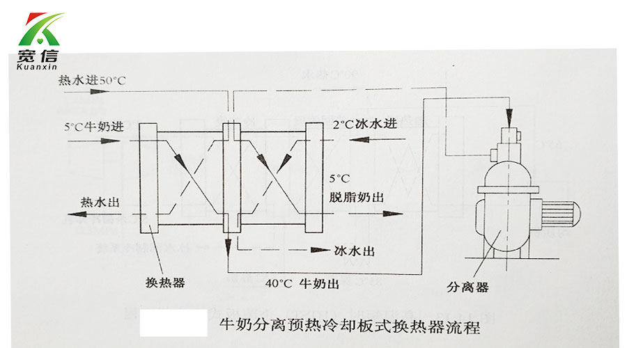 乳制品廠也使用板式換熱器進行牛奶脂肪分享前的預熱和脫脂奶的冷卻。工藝過程如下圖所示: