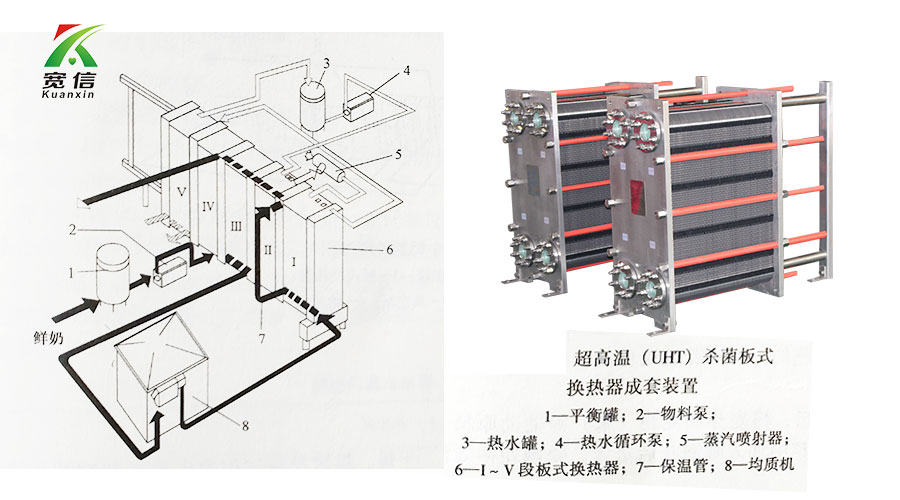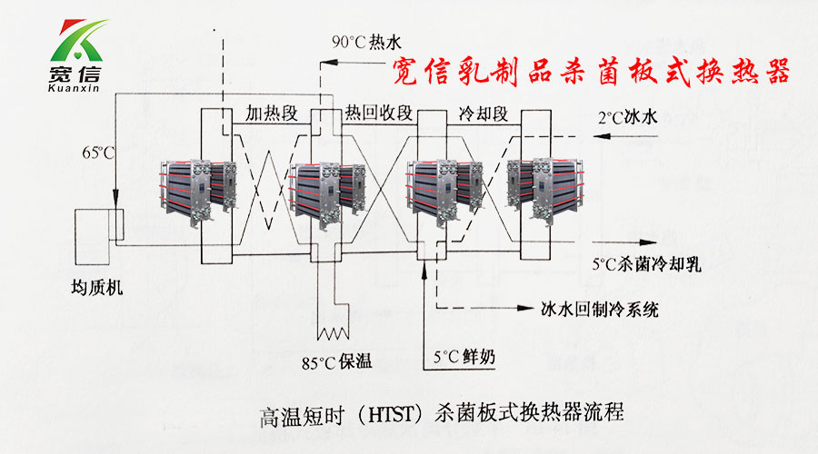 在乳制品工藝中,寬信板式換熱器廣泛用于鮮乳的高溫短時(HTST)和超高溫(U.H.T)殺菌中。它也可用作鮮乳的高溫殺菌工藝流程。該板式換熱器分為三段,熱回收段、殺菌段和冷卻段。