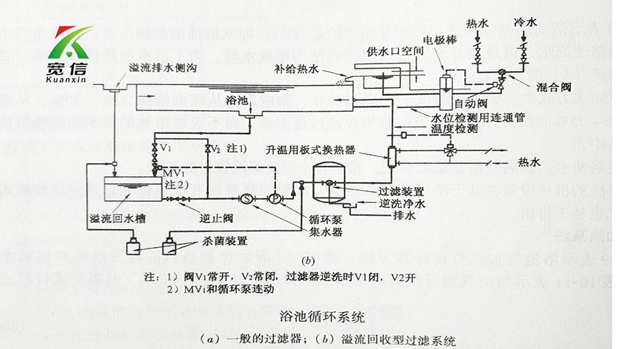 上圖中表示浴池的循環(huán)系統(tǒng)。常使用的是(a),即從浴池的側(cè)面供水,從底面回水的方式,但當(dāng)浴池原水(溫泉或者井水)量不充分或使用市政水時(shí),為了節(jié)水降低加熱量,也可采用回收溢流(b的方式)。