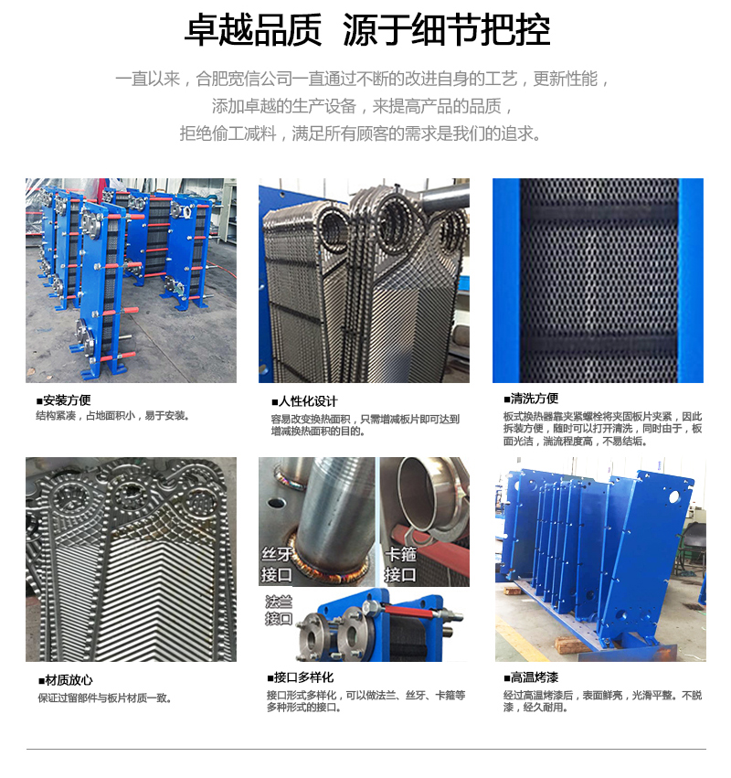 寬信公司是專業(yè)生產(chǎn)熱交換器的生產(chǎn)廠家,嚴(yán)格按照《GB16409-1996》板式換熱器國家標(biāo)準(zhǔn)執(zhí)行,寬信在生產(chǎn)板式換熱器的基礎(chǔ)上,研制開發(fā)了具有國際先進(jìn)技術(shù)水平的新一代智能換熱機(jī)組,具有傳熱效率高,阻力小,結(jié)構(gòu)緊湊,運(yùn)行可靠,操作簡(jiǎn)單直觀等優(yōu)點(diǎn),是高效率節(jié)能產(chǎn)品。