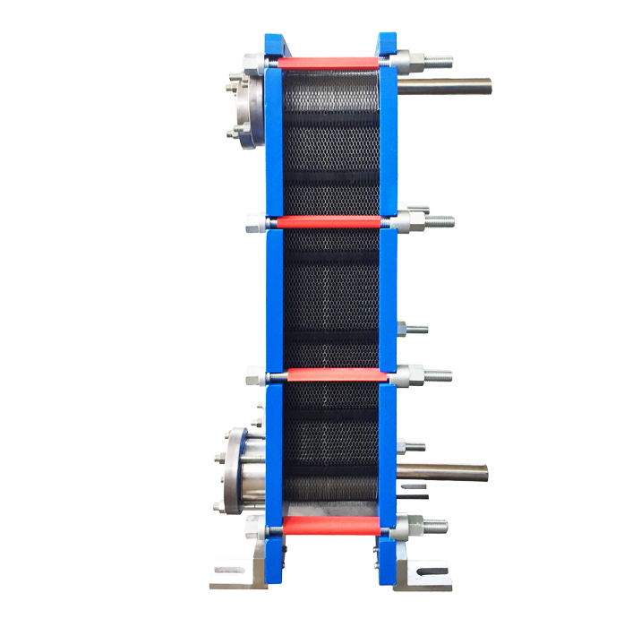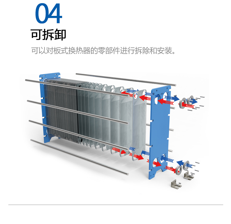 板式換熱器是由一組波紋金屬板組成,板片上有四個(gè)角孔,以供熱交換的兩種液體通過。金屬板片安裝在一個(gè)側(cè)面有固定板和活動(dòng)壓緊板的框架內(nèi),并用夾緊螺栓夾緊。板片上裝有密封墊片,將流體通道密封,并且引導(dǎo)流體交替地流至各自通道內(nèi)波紋板不僅提高了湍流程度,并且形成許多支撐點(diǎn),足以承受介質(zhì)間的壓力差。金屬板和活動(dòng)壓緊板懸掛在上導(dǎo)桿,并由下導(dǎo)桿定位,而桿端則固定在支撐柱上。